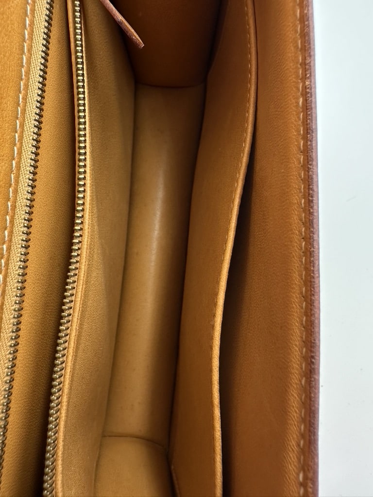 Very goodVery good condition. Stains and discoloration on the interior flap of the bag. A few marks on the leather. Scratches on the hardware. Overall very good condition for a vintage bag. The leather on the shoulder strap is slightly cracked in some areas.