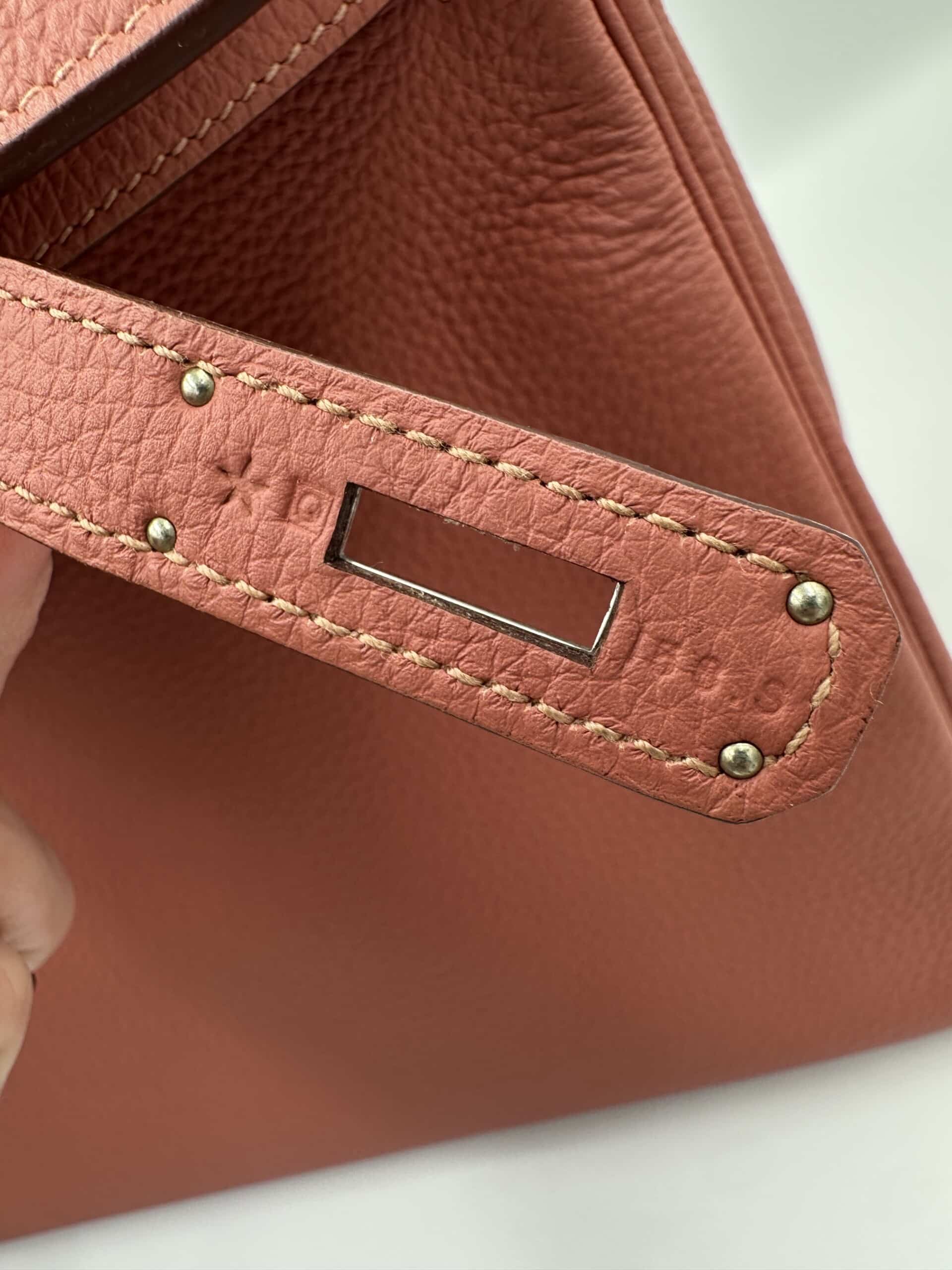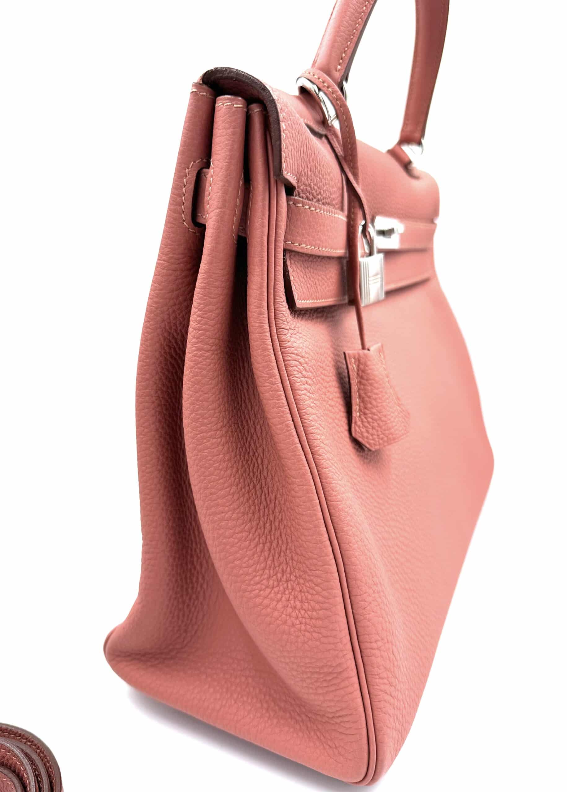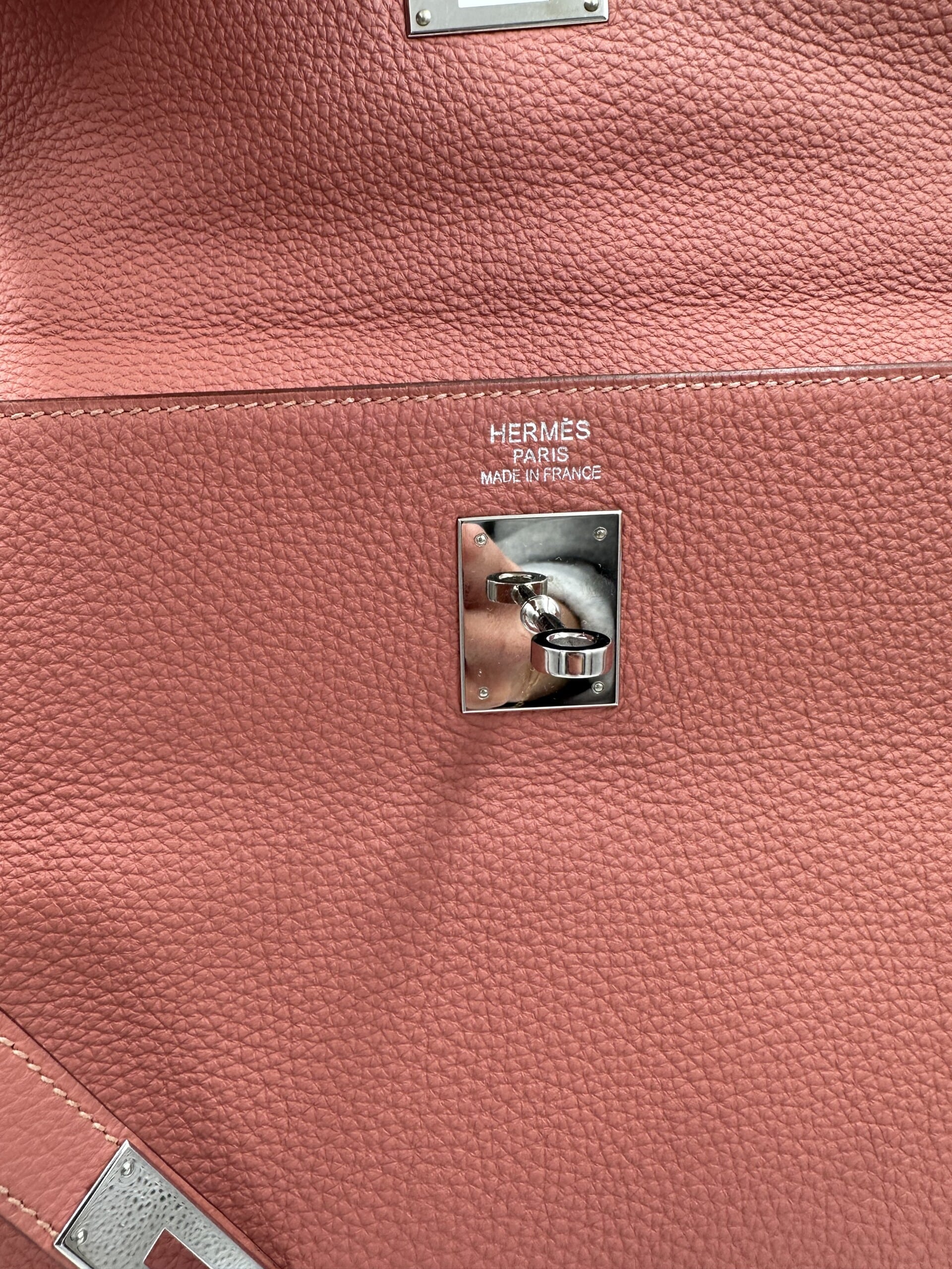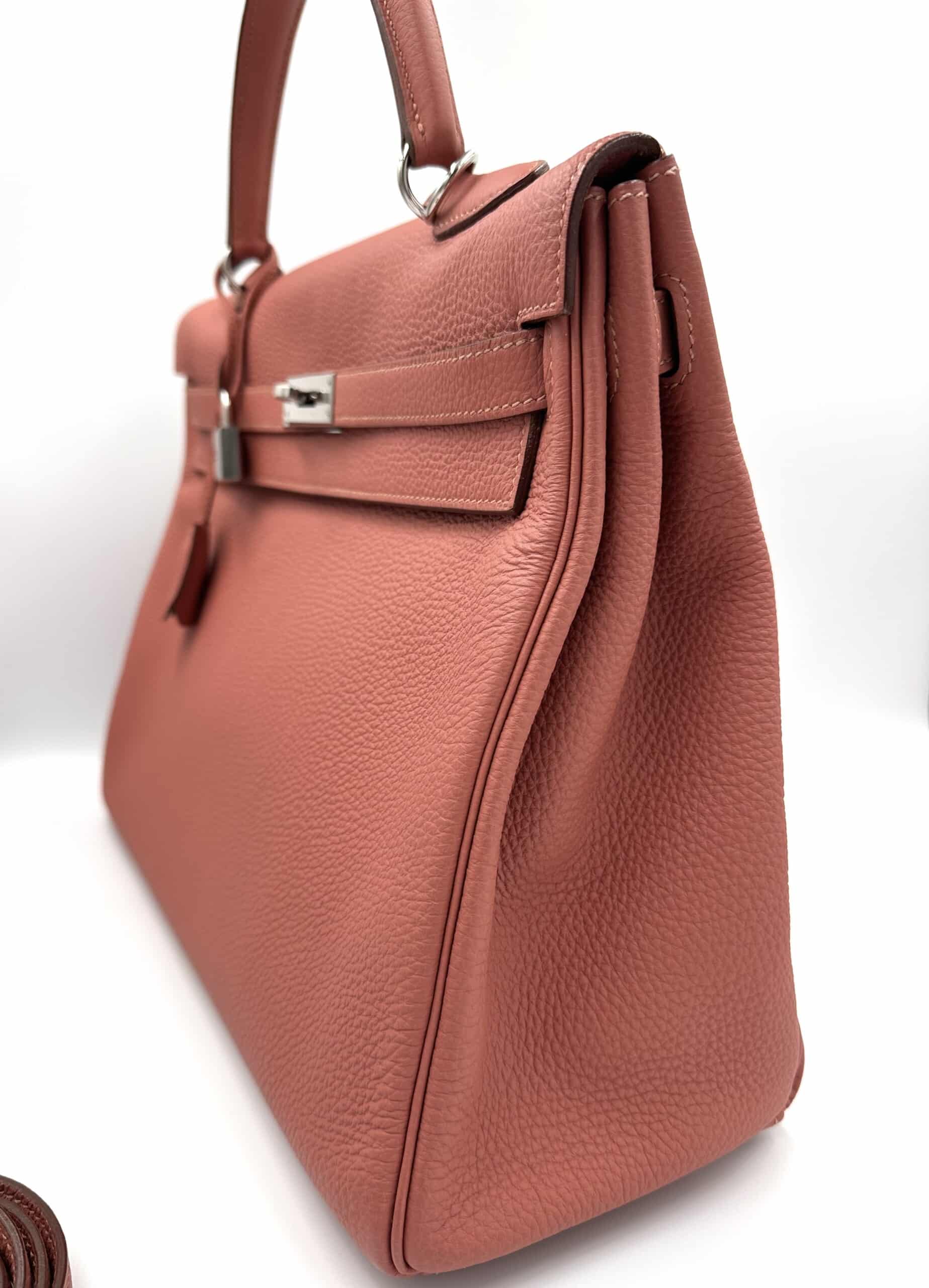Le modèle proposé ici est un Kelly 35 en Crevette (Pink Tea), une couleur neutre aux nuances de rose et de saumon, avec bijouterie argentée, datant de 2013.