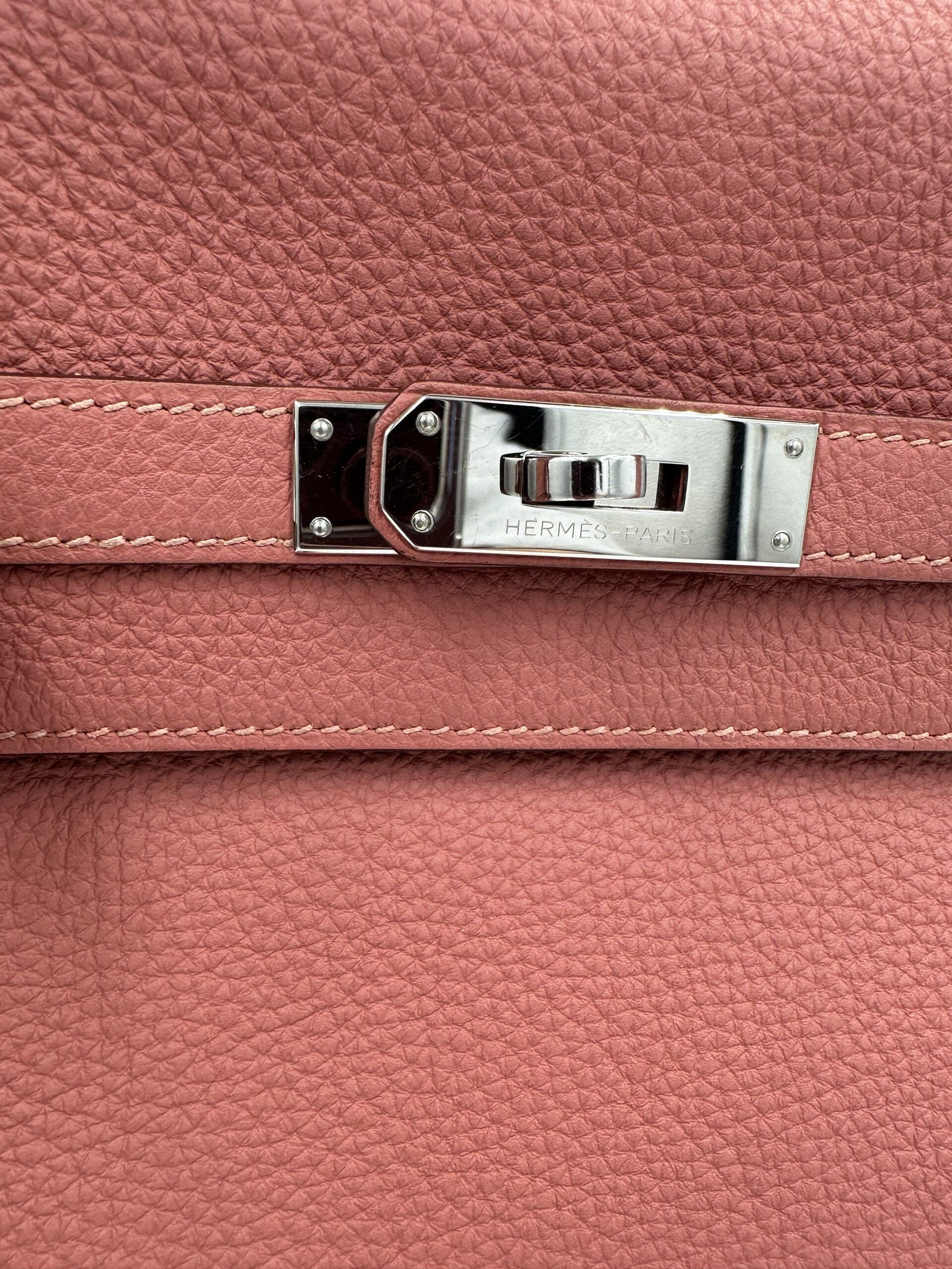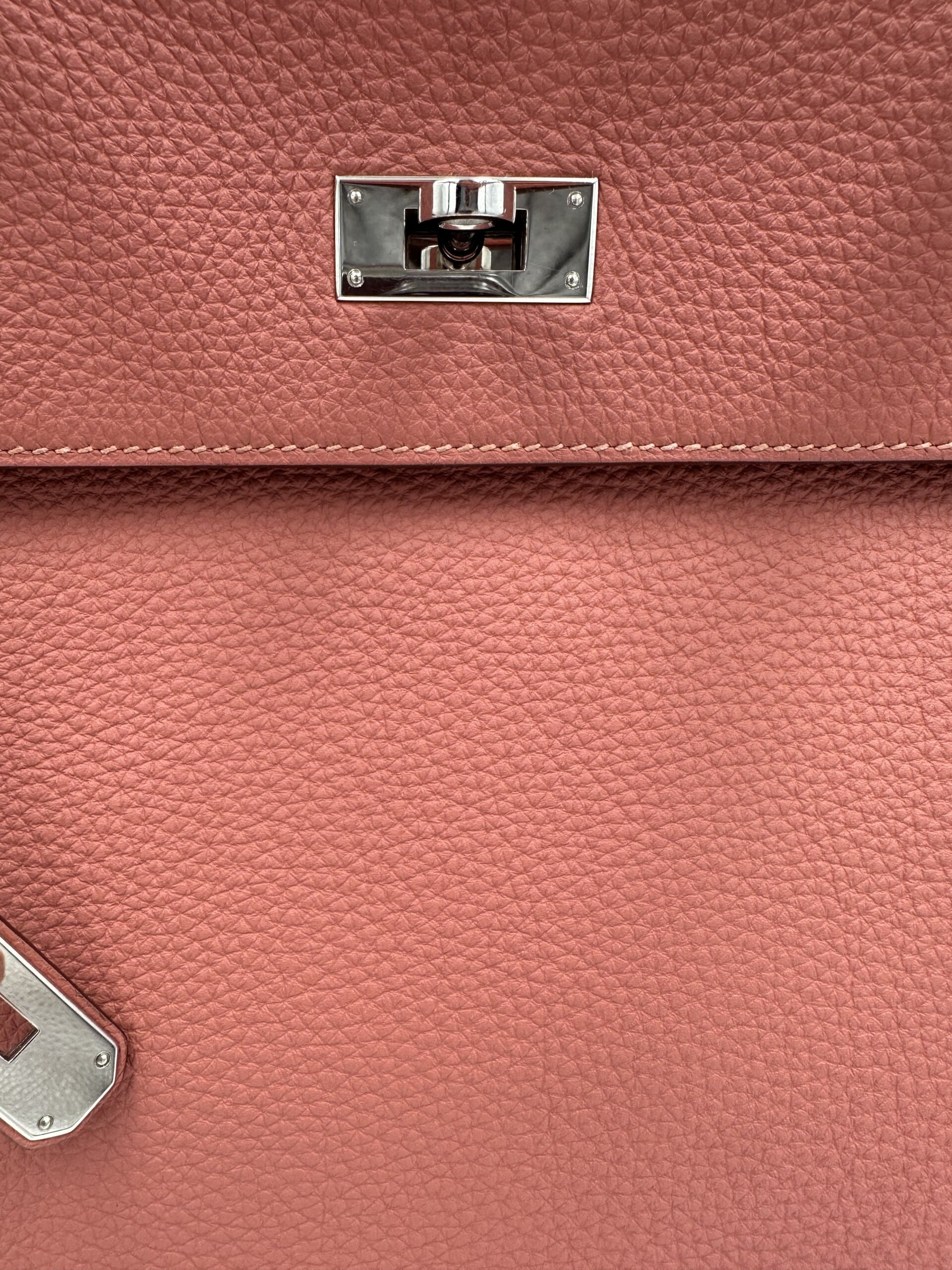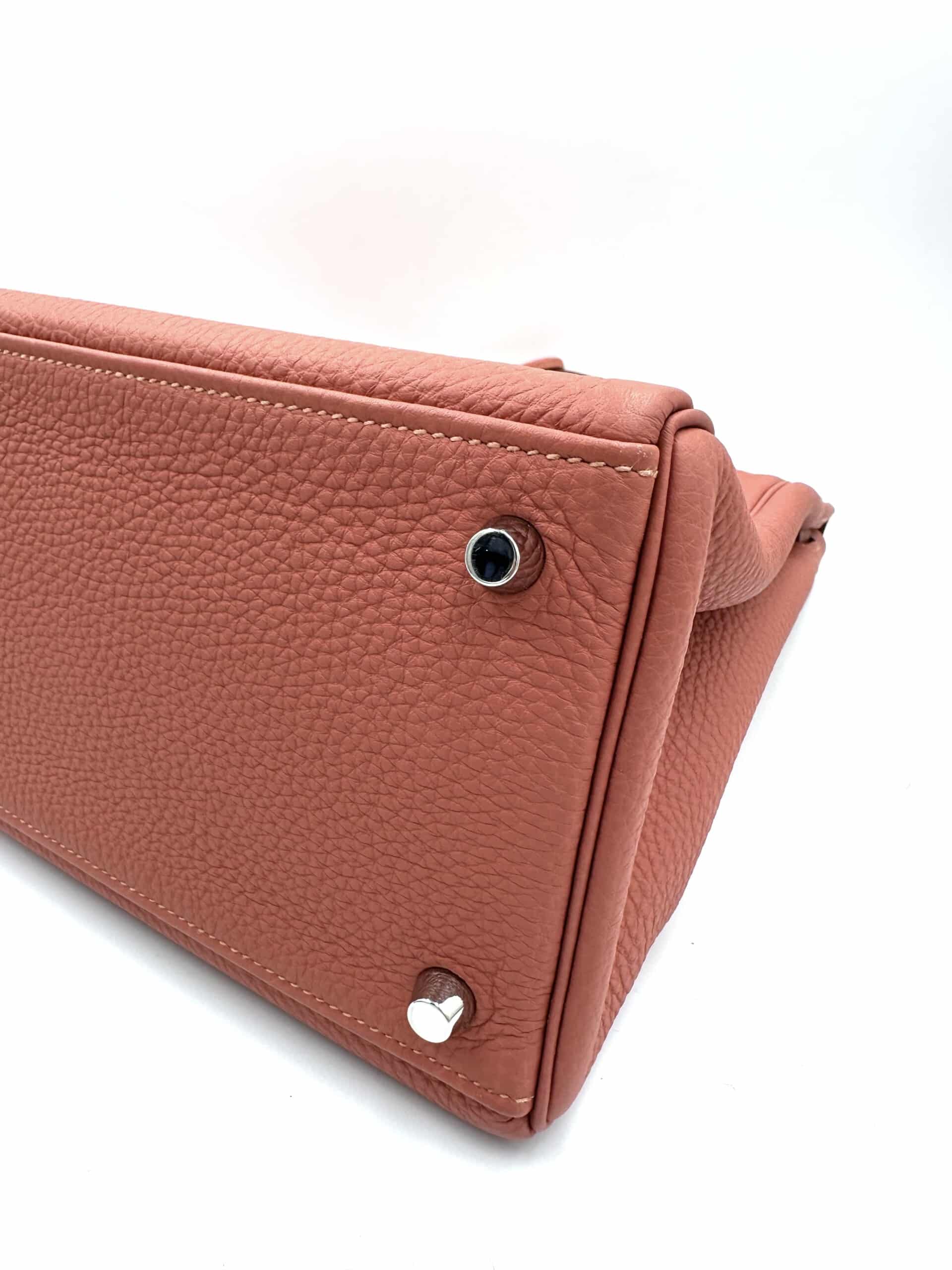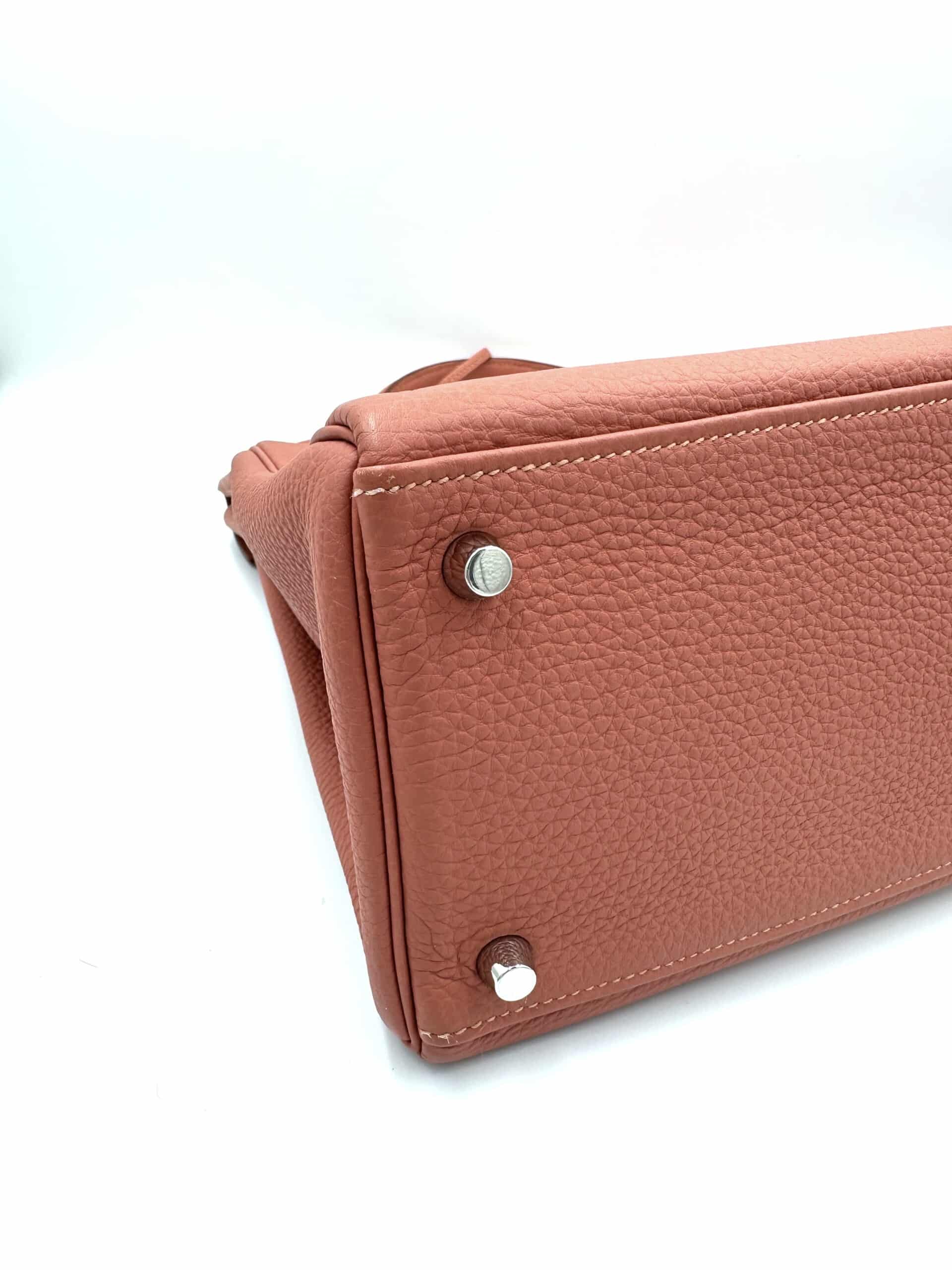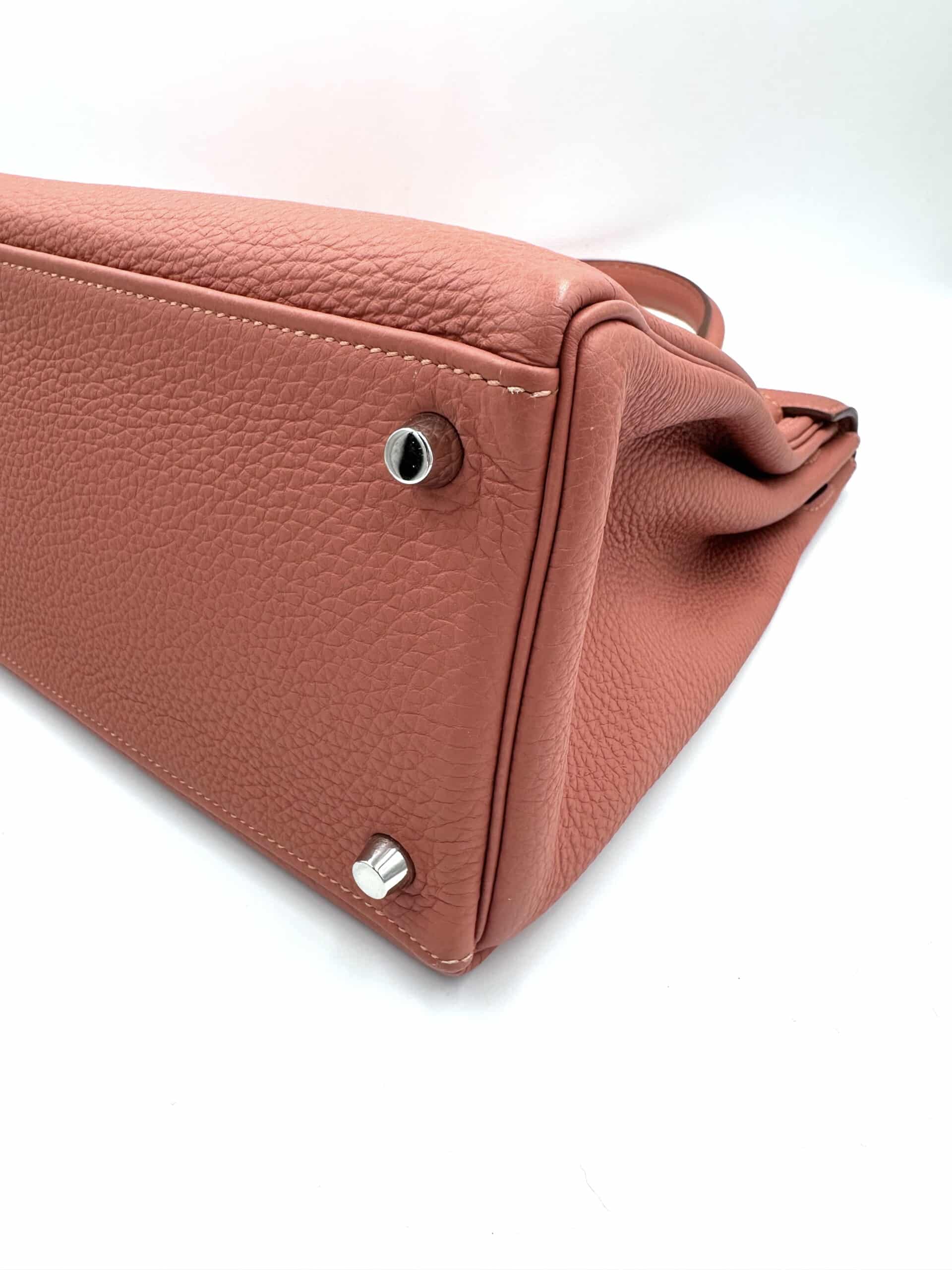 Le modèle proposé ici est un Kelly 35 en Crevette (Pink Tea), une couleur neutre aux nuances de rose et de saumon, avec bijouterie argentée, datant de 2013.