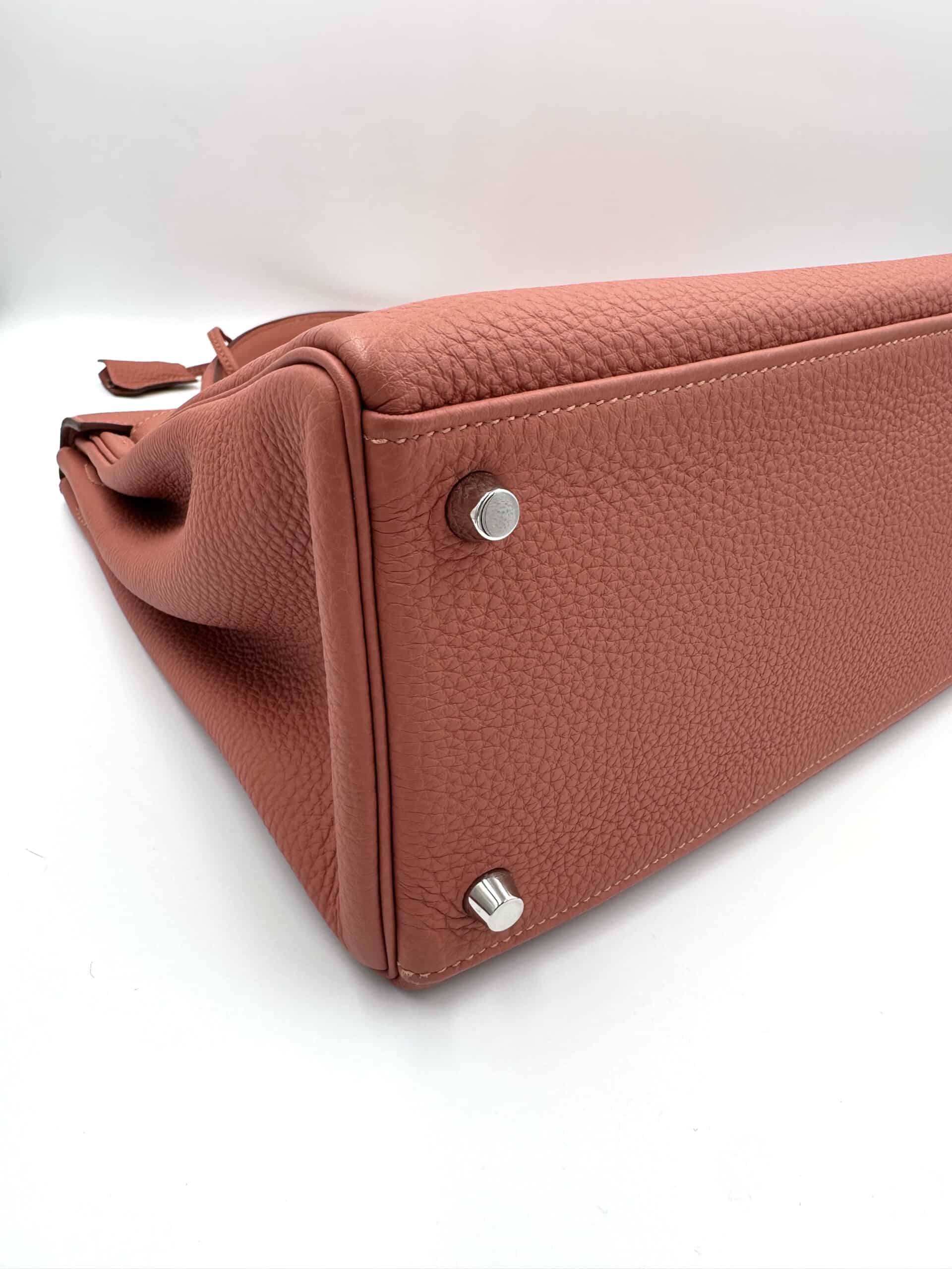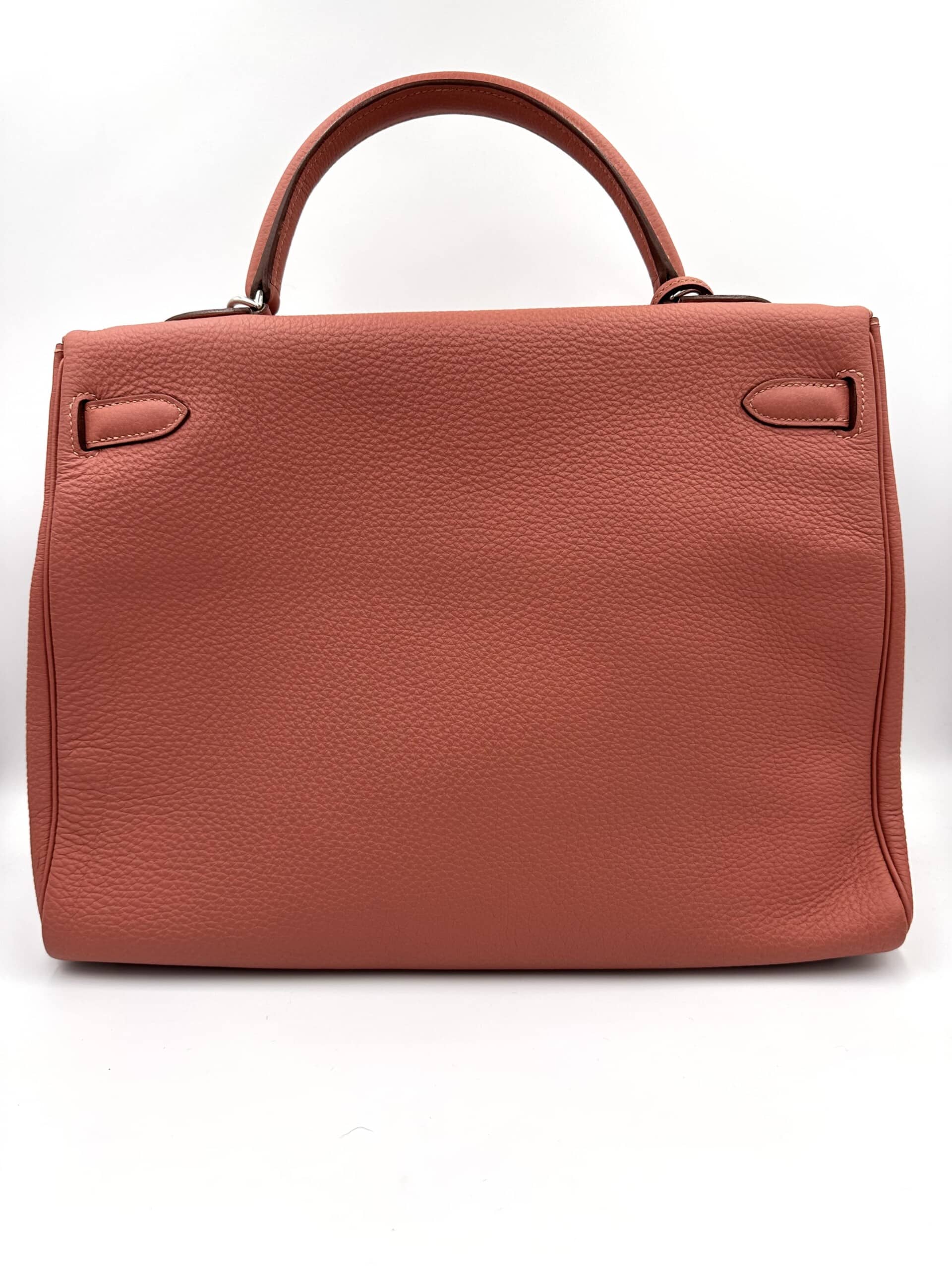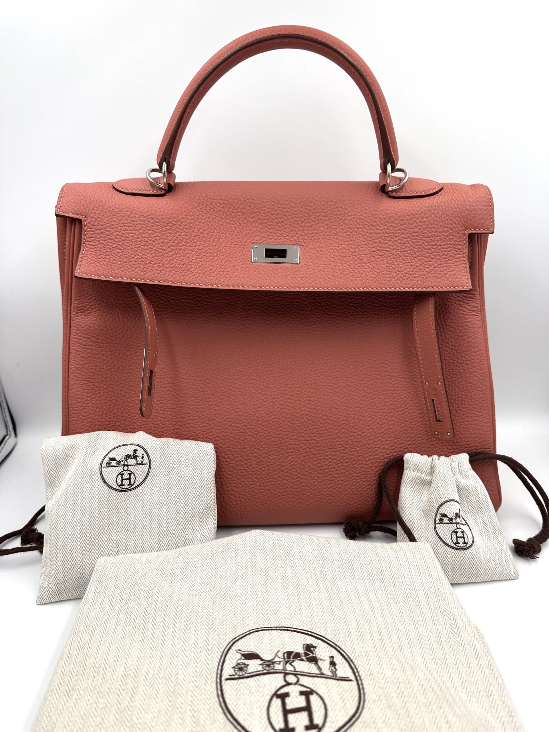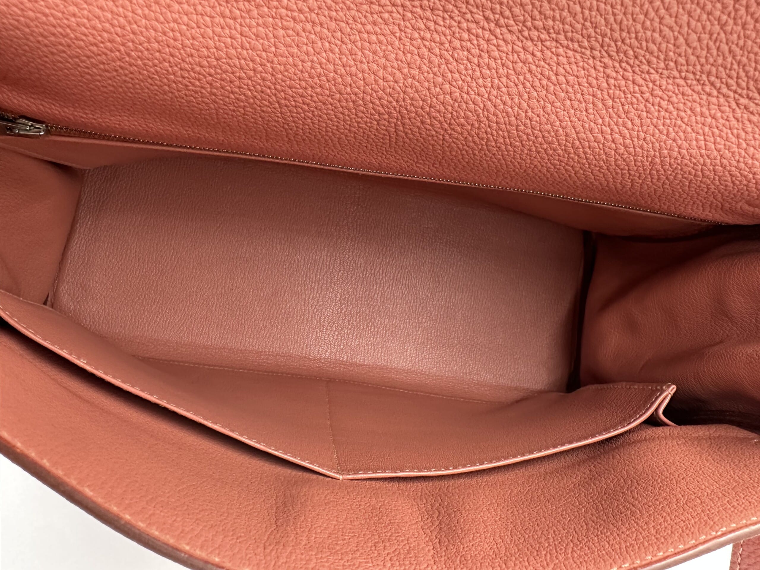 Le modèle proposé ici est un Kelly 35 en Crevette (Pink Tea), une couleur neutre aux nuances de rose et de saumon, avec bijouterie argentée, datant de 2013.